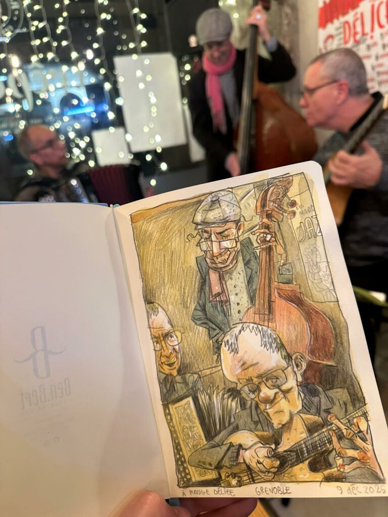 Une bonne soirée avec le Trio “Soudain La Lune…”. (Philippe Reis, accordéon / Jérôme Chartier, contrebasse et moi). Le dessin est de Ben Bert et la vidéo m’a été transmise par Enikő.